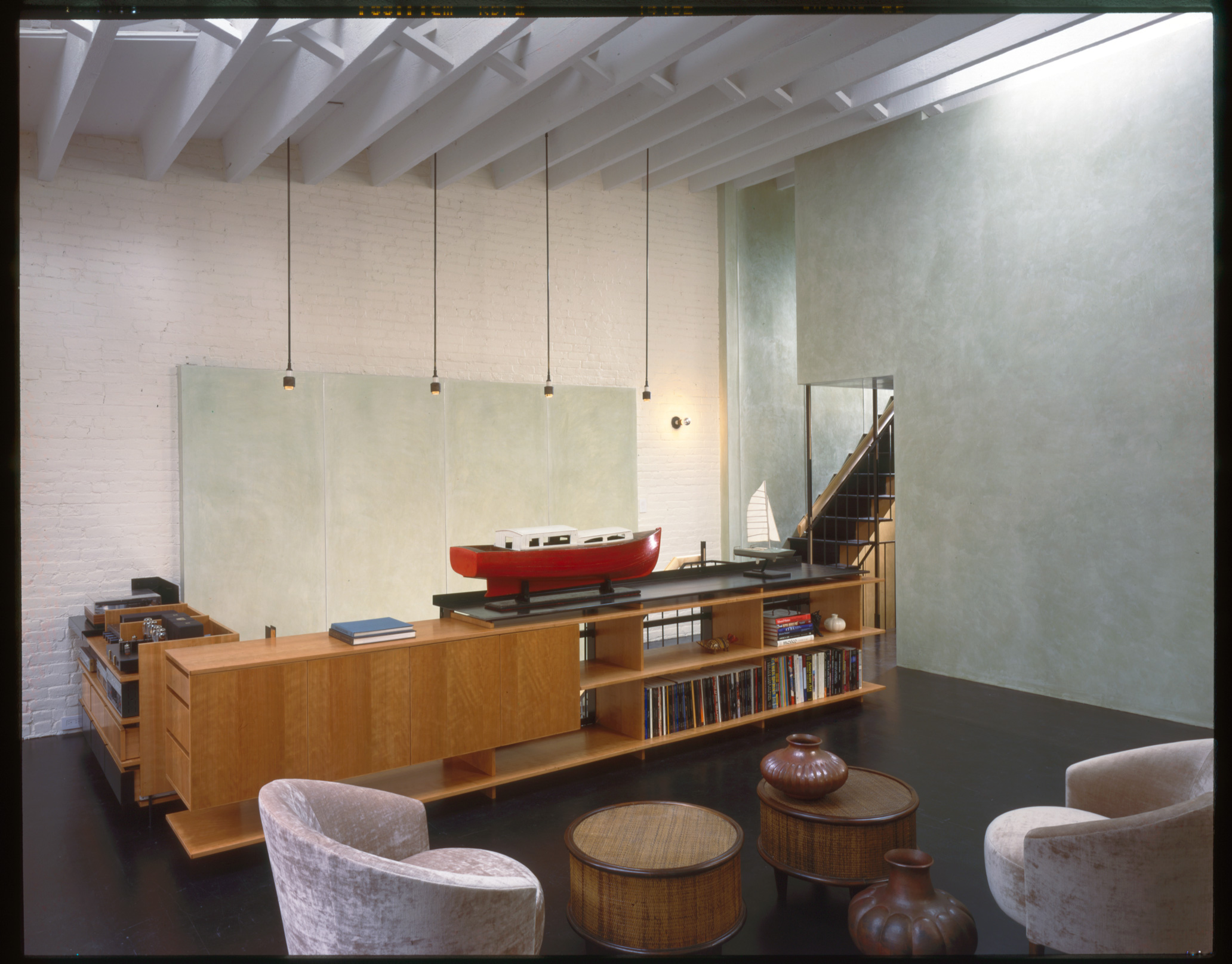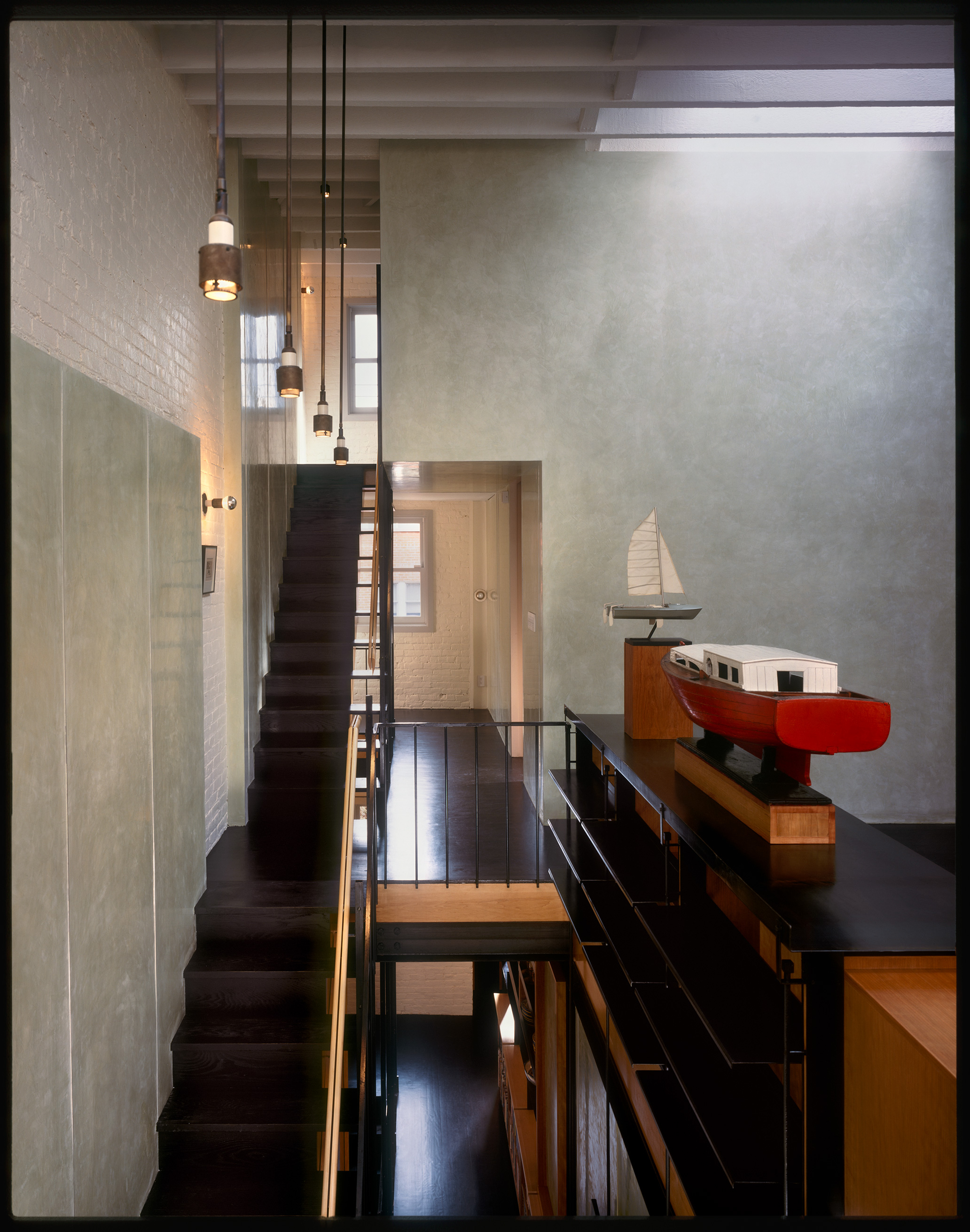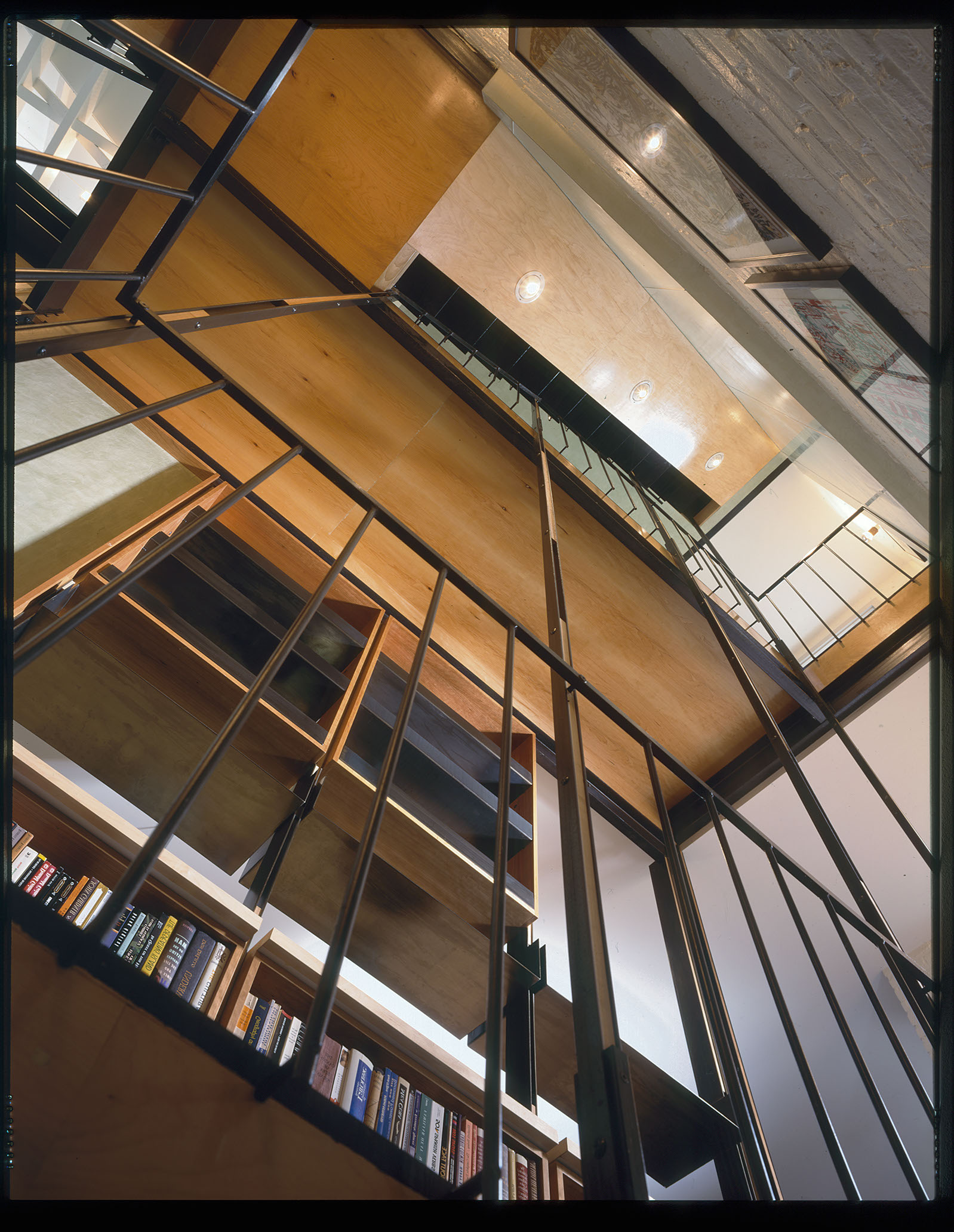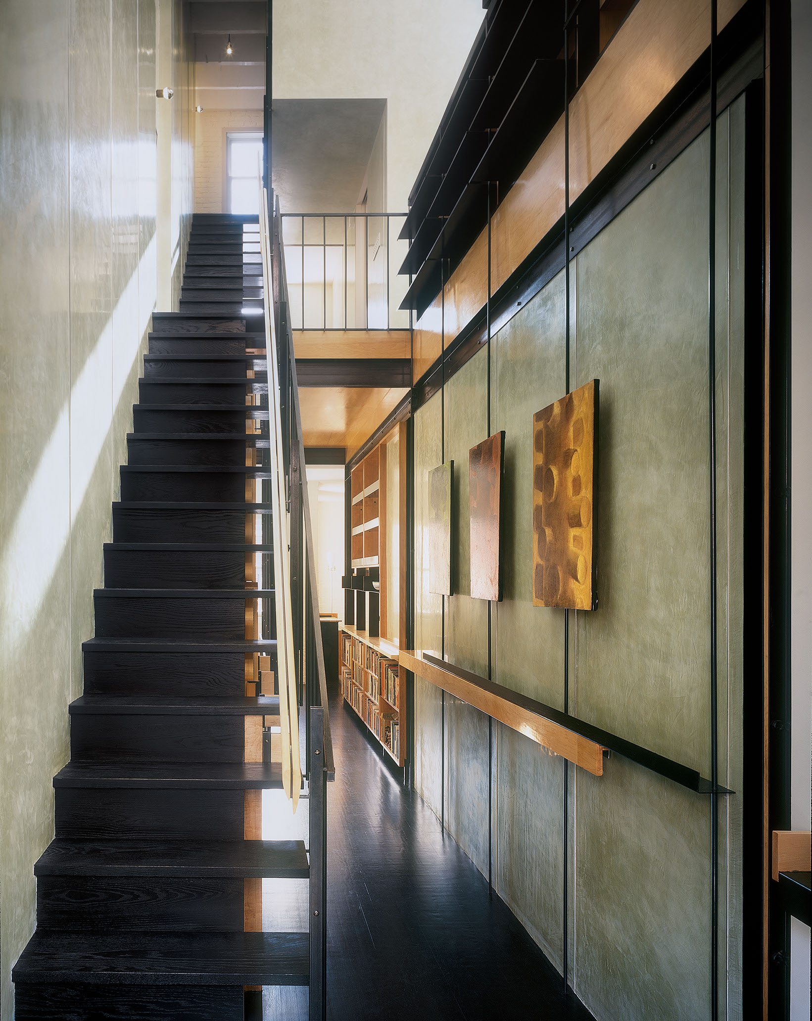 During the day, sunlight cuts through all floors, running from the entry vestibule to the rear of the lot; this arrangement tacitly acknowledges the front-to-back connection and original organization of the carriage house. In the Luminist tradition, pathways like roads and streams would weave from the front to the back of a composition, inviting the viewer into a narrative that unfolds as focus moves into the distance. Interior light plays a similarly organizational role here, connecting the four floors and creating a continuous, illuminated path that passes through fields of books and ephemera. In this way, the staircase resolves the owners’ desire for an uncluttered and expansive living space which acts as a conduit for spatial organization, circulation, storage space, and furniture arrangements.