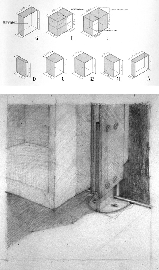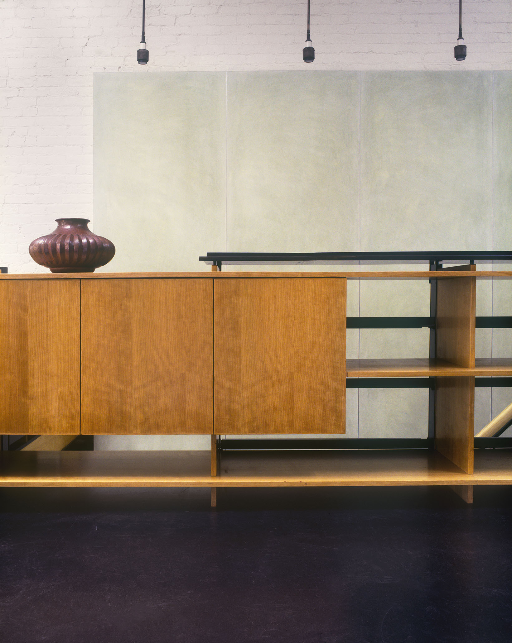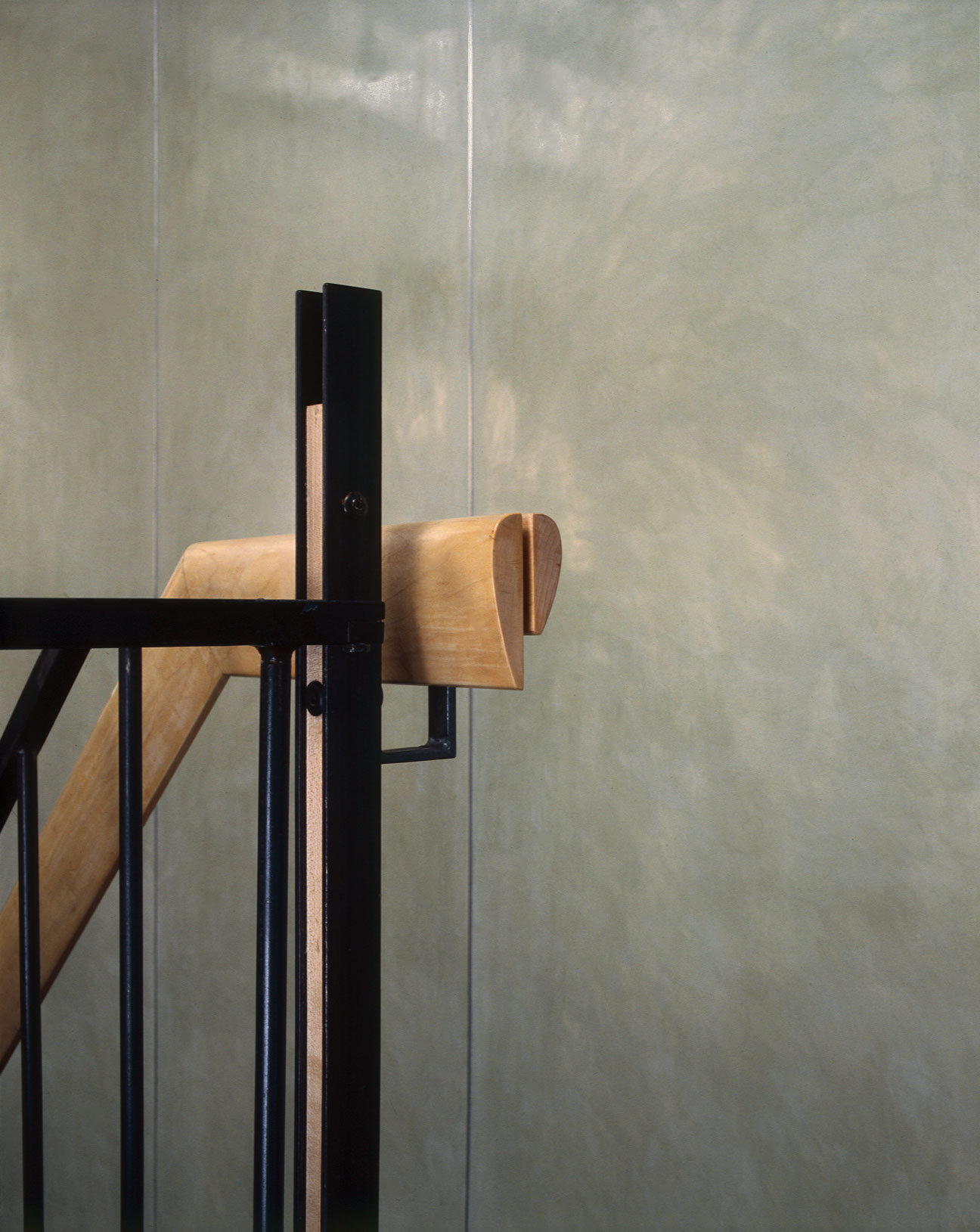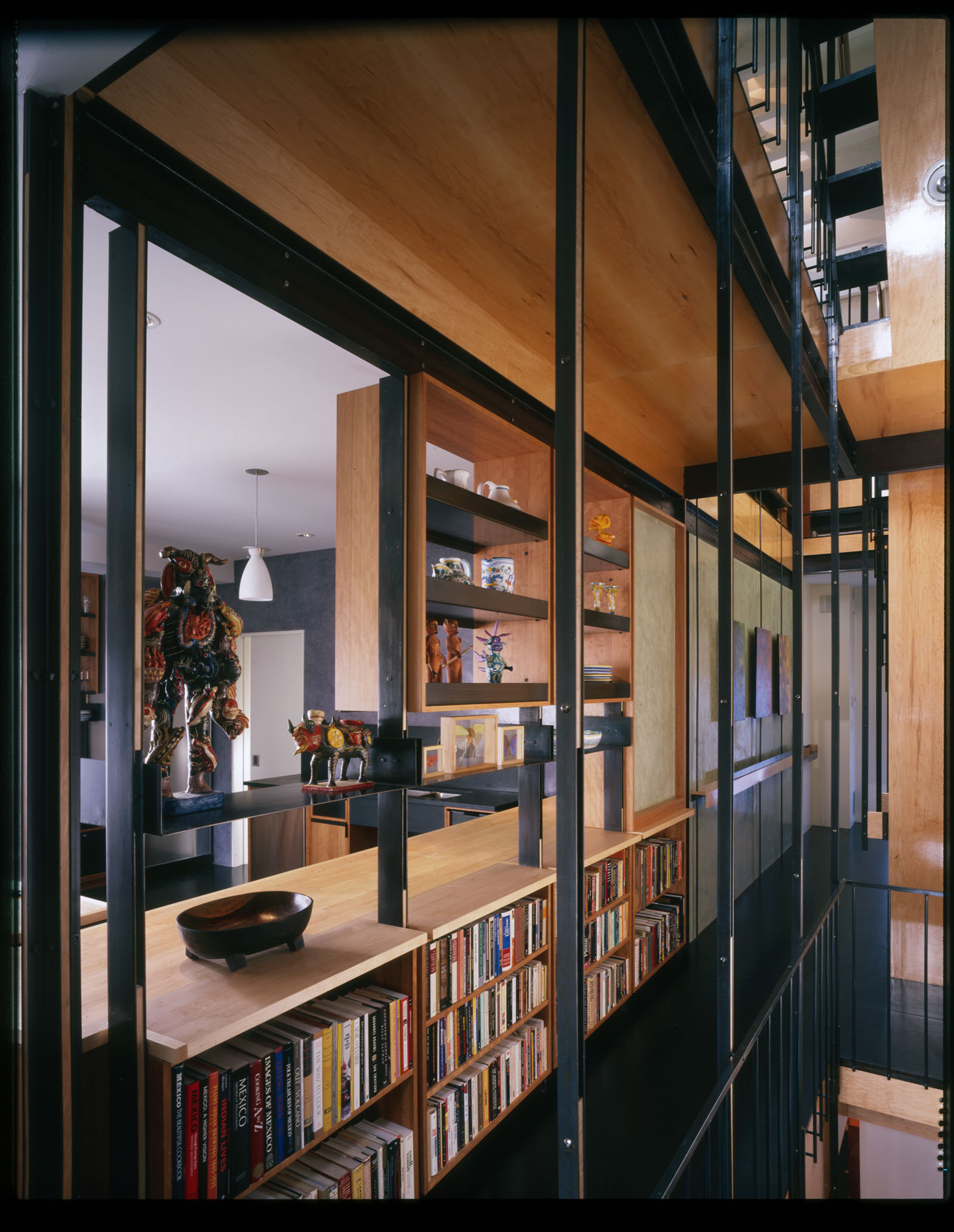 During the day, sunlight cuts through all floors, running from the entry vestibule to the rear of the lot; this arrangement tacitly acknowledges the front-to-back connection and original organization of the carriage house. In the Luminist tradition, pathways like roads and streams would weave from the front to the back of a composition, inviting the viewer into a narrative that unfolds as focus moves into the distance. Interior light plays a similarly organizational role here, connecting the four floors and creating a continuous, illuminated path that passes through fields of books and ephemera. In this way, the staircase resolves the owners’ desire for an uncluttered and expansive living space which acts as a conduit for spatial organization, circulation, storage space, and furniture arrangements.